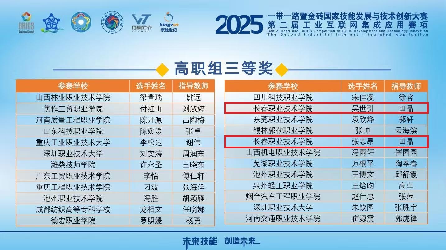 近日,2025一带一路暨金砖国家技能发展与技术创新大赛第二届工业互联网集成应用赛项决赛落幕。我校师生在比赛中表现优异,取得了突出成绩。其中,信息学院教师于皓宇荣获教师组二等奖,由教师田晶指导的学生团队获高职组一等奖1项、三等奖2项。
