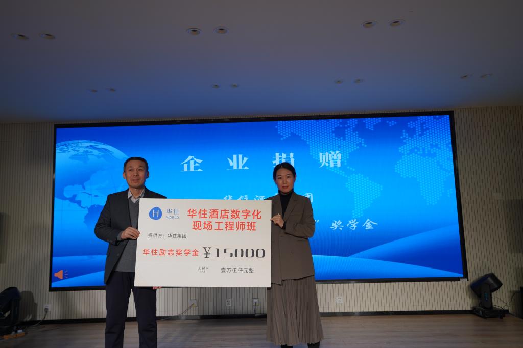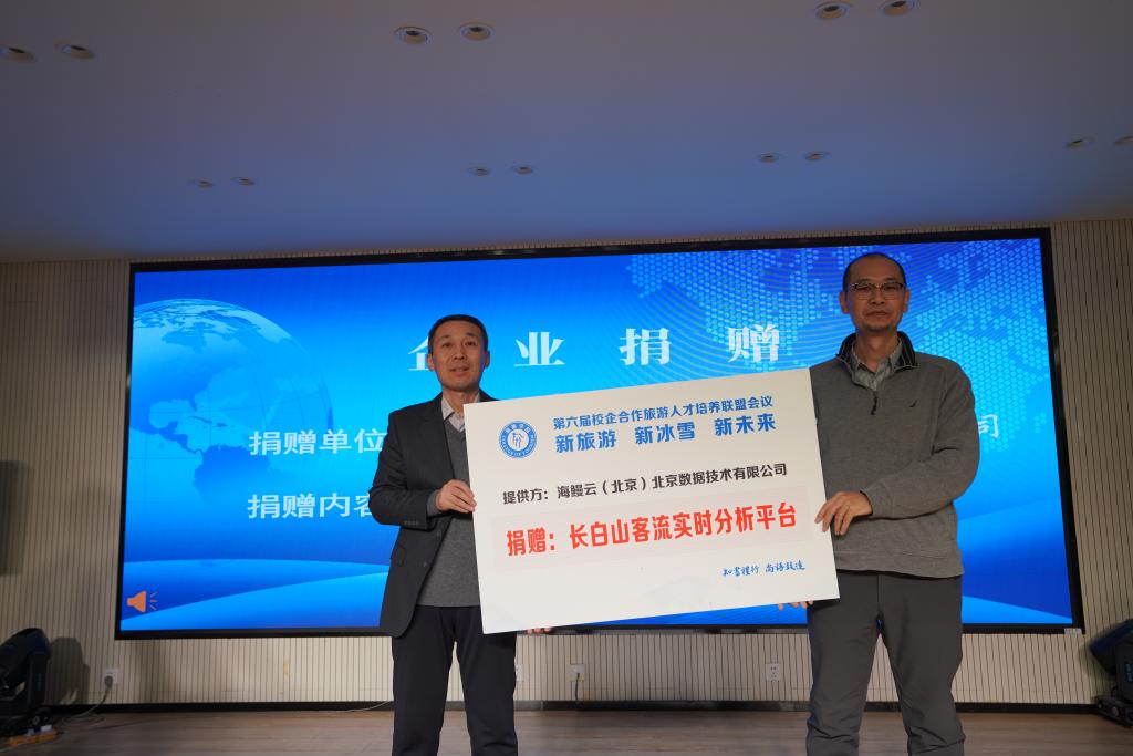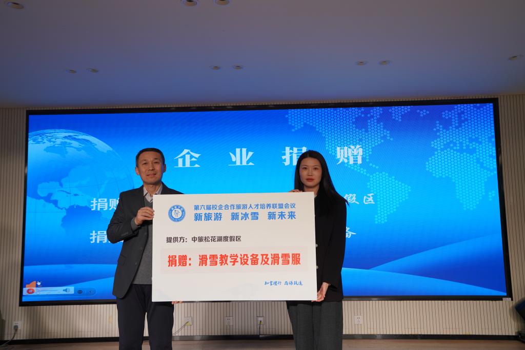 合作企业始终心系学院发展,以实际行动支持人才培养。大会现场举行企业捐赠仪式,华住集团捐赠15000元设立“华住现场工程师班奖学金”;海鳗云(北京)数据技术有限公司捐赠“长白山客流实时分析平台”,为旅游大数据教学提供前沿技术支撑;中旅松花湖度假区捐赠滑雪教学设备,赋能冰雪旅游专业实践教学。学院党总支书记马春志代表学院接受捐赠。
