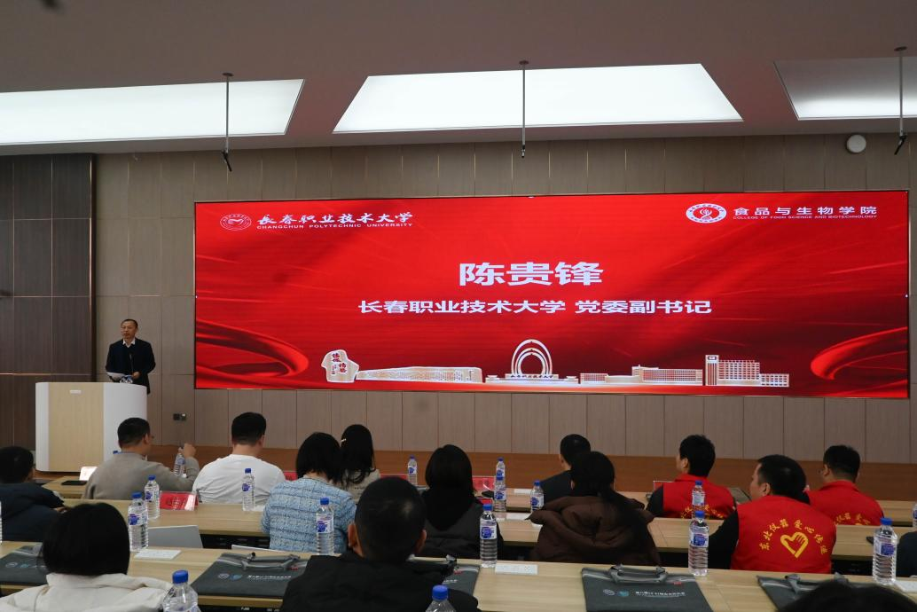 寒冬岁末,暖意融融。12月18日下午,长春职业技术大学食品与生物学院“师生同心筑梦健康中国 校企携手共绘创新蓝图”校企合作大会在商贸学院阶梯教室隆重举行。学校党委副书记陈贵锋出席会议并讲话,长春金赛药业有限责任公司人力总监崔文思,优秀校友中粮集团家佳康吉林区经理张亮、吉林茂辉科技有限公司总经理李茂,海基亚生产经理王和元,家长代表以及学院师生共230余人参加会议。