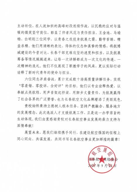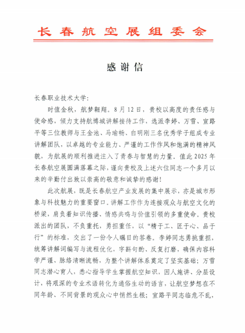 在近日圆满落幕的2025长春航空展上,我校选派师生组成的讲解团队,因表现突出,获得了航空展组委会的书面感谢。