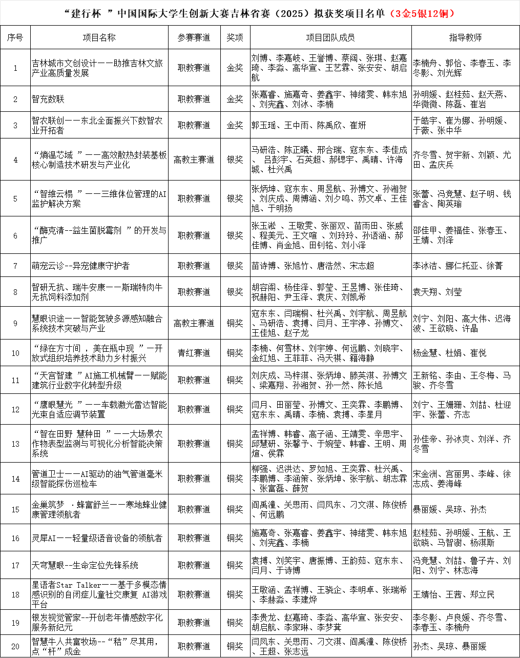 2025年“建行杯”中国国际大学生创新大赛吉林省赛于7月在北华大学圆满落幕。我校师生凭借扎实的专业功底与突出的创新能力斩获佳绩,共荣获金奖3项、银奖5项、铜奖12项,并获得优秀组织单位称号。充分展现了我校创新创业教育的丰硕成果与学子的卓越风采。