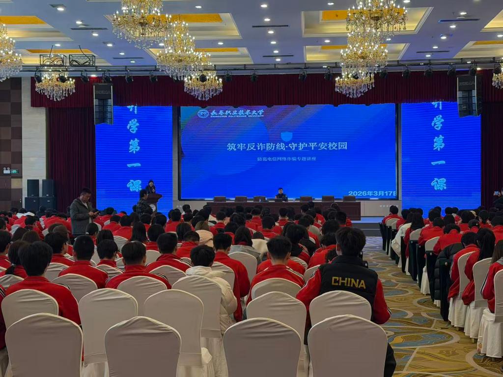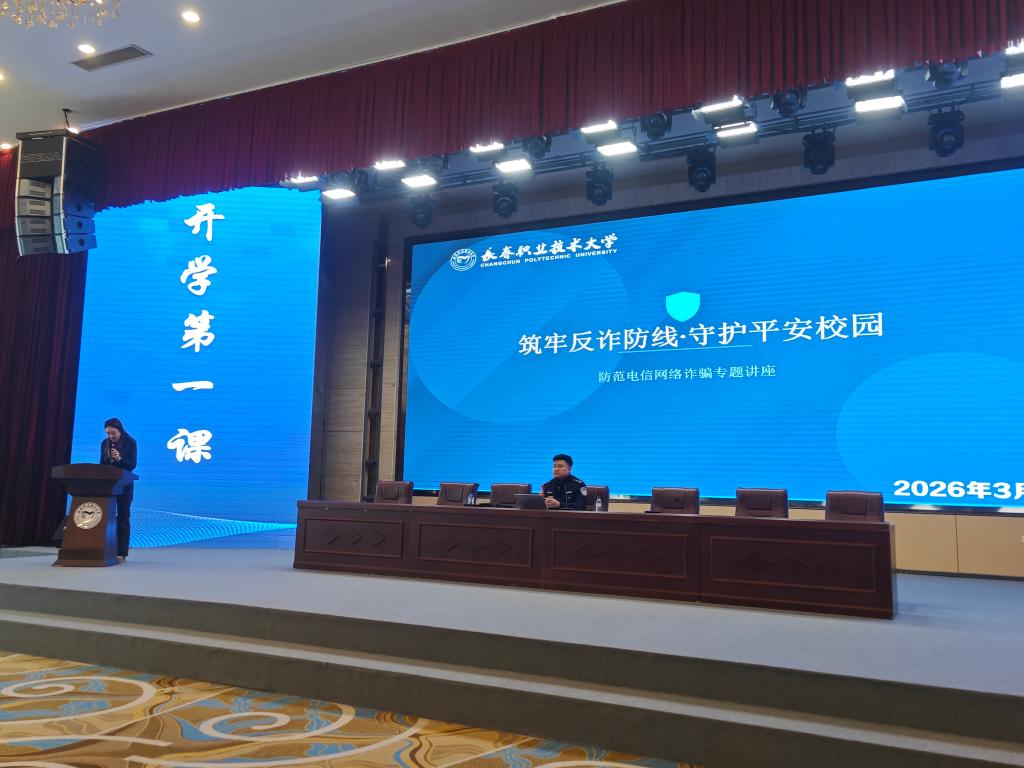 为进一步提升我校学生防范电信网络诈骗的意识和能力,守护学生财产安全,筑牢校园反诈防火墙,2026年3月17日,临河街派出所副所长梁桓禹一行走进长春职业技术大学,为全体学生开展了一场主题鲜明、内容详实的电信网络反诈专题宣讲活动,用专业知识为同学们送上“反诈安全礼包”。学校始终将学生安全放在重要位置,此次宣讲也是学校深化安全育人、推进“无诈校园”建设的重要举措之一。