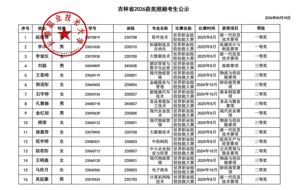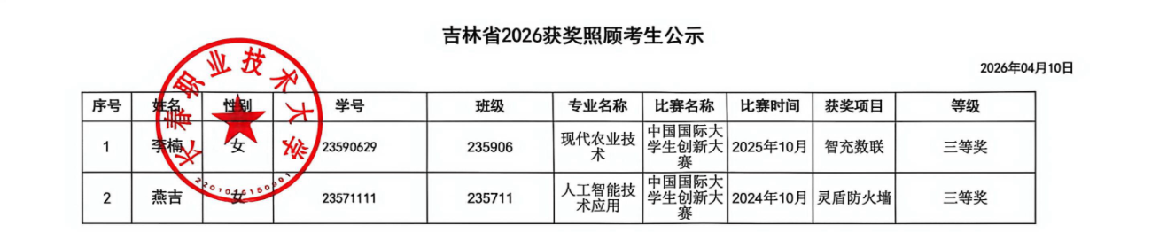 根据吉林省教育考试院《关于做好吉林省2026年普通高等学校专升本考试招生工作的通知》文件要求,经本人申报,学院审核,学校复审,共有16名参加“世界职业院校技能大赛”同学和2名参加“中国国际大学生创新大赛”同学符合获奖照顾加分资格。具体情况如下表: